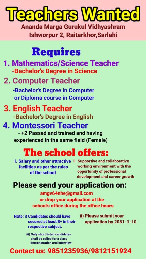 AMGV Public School is seeking some qualified and energetic teachers. If you are interested in teaching, please, feel free to apply (male or female) or contact soon.